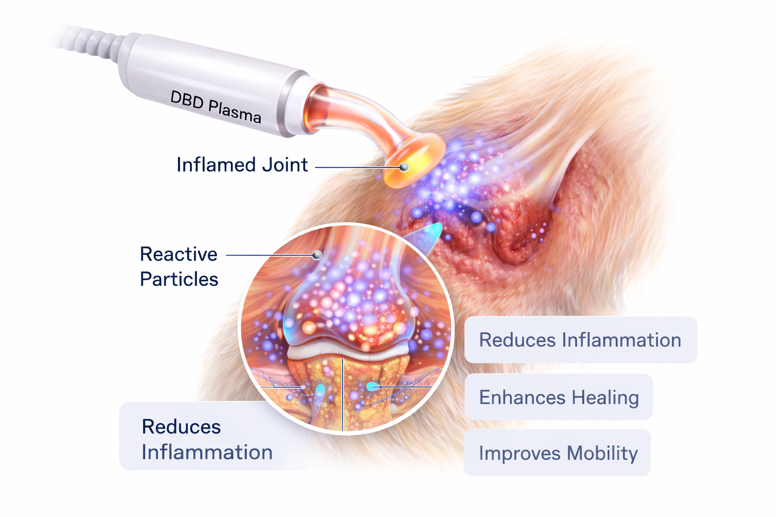 PlasmaCareVet provides advanced support for joint, muscle, and musculoskeletal conditions in pets using DBD Plasma and Cold Plasma technologies. By improving local oxygenation and stimulating cellular activity, plasma therapy helps reduce inflammation, ease stiffness, and support tissue recovery in injured or stressed areas.